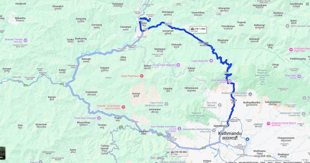 Here we can see routes to reach our destination. We can go via the Tokha Chhahare Route, the Kakani Route, or the Galchhi Route. I think the Tokha route is the fastest. I’ve already described this route in my blog post about my Dupcheshwor trip, which you can read by clicking here. We actually visited both places on the same trip. Initially, we planned to visit only the Dupcheshwor Temple, but later decided to extend our trip to include this destination as well. You can also visit both places in Nuwakot in a single day, just start your journey early in the morning.